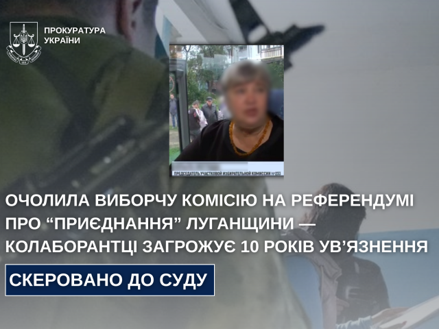 Прокурори Чернівецької обласної прокуратури направили до суду обвинувальний акт стосовно 65-річної мешканки Луганщини, яка під час окупації добровільно очолила виборчу комісію на псевдореферендумі про «приєднання» регіону до росії.