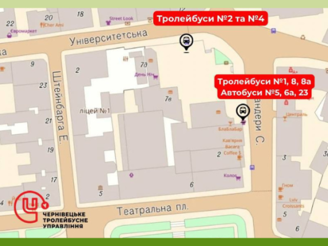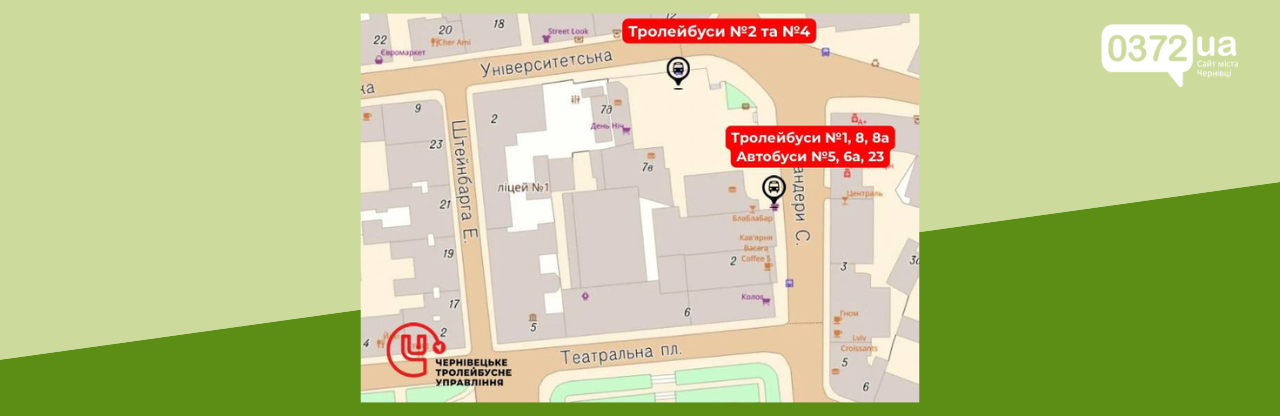 Зупинка "Кінотеатр Чернівці" знову працює для пасажирів тролейбусів №2 та №4. Зупинка "Площа Театральна" відновила роботу для тролейбусів №1, №8, №8а та автобусів №5, №6а, №23.