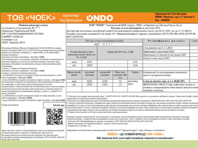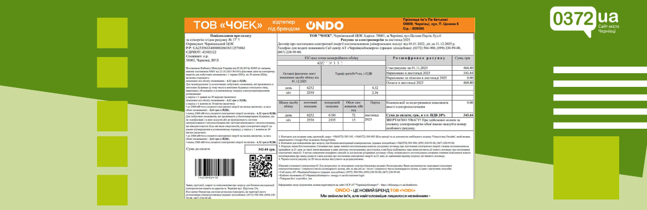 З 1 грудня ТОВ "ЧОЕК" почало працювати під новим брендом, повідомляє компанія. У грудні споживачі Чернівецької області вперше отримають квитанції з оновленим логотипом. Про це журналістам видання 0372 повідомили в енергопостачальній компанії.