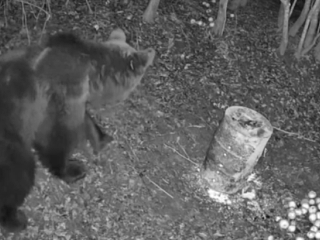 На відео видно, як ведмідь завітав на локацію, де єгері викладають їжу для оленів і козуль.