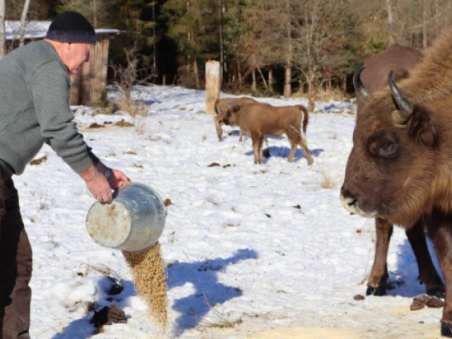 Ці червонокнижні дикі тварини понад пів року – із середини травня до кінця жовтня – харчуються природними кормами. Взимку на їхню підгодівлю витрачаються тонни кормів. Залежно від віку та ваги, один зубр за один раз споживає від 5 до 15 кг.
