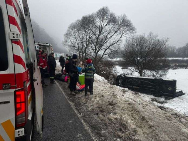 Уточнюється, що о 8:36 надійшло повідомлення, що через ожеледь мікроавтобус Mercedes Sprinter раптово з'їхав з траси між Перечином та Зарічово й перекинувся на бік.