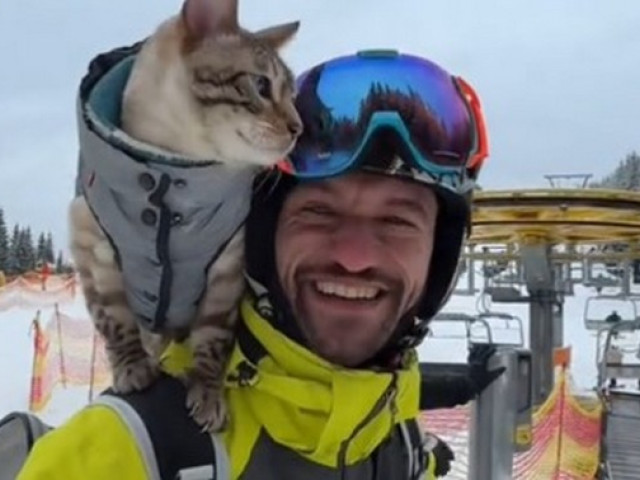 На Буковелі помітили чоловіка, який катається з котом на лижах. Під час стрімких спусків кіт сидить на плечі чоловіка.
