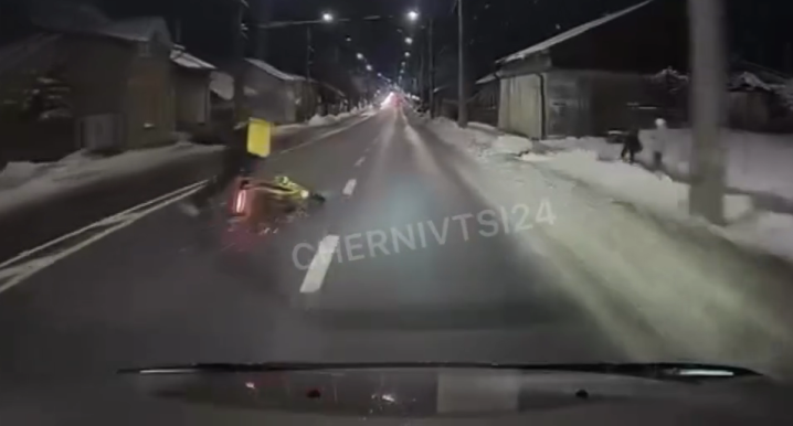 У Чернівцях на Руській кур’єр на скутері ледве не залетів під авто через ожеледицю. Водій скутера раптово впав посеред дороги.