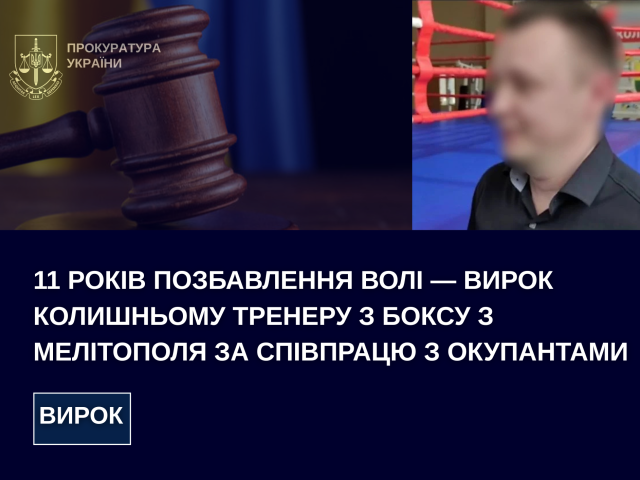 За публічного обвинувачення ювенальних прокурорів Чернівецької обласної прокуратури 39-річного жителя Мелітополя, який до тимчасової окупації міста працював тренером з боксу у спортивній школі, визнано винним у колабораційній діяльності та пособництві державі-агресору (ч. 5 ст. 111-1, ч. 1 ст. 111-2 КК України).