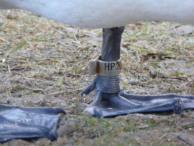 Тут зазначають, що важливо звернути увагу на лапи птахів. Серед них є обкільцьовані орнітологічними кільцями. Написи на кільцях свідчать про міграційні шляхи лебедів.