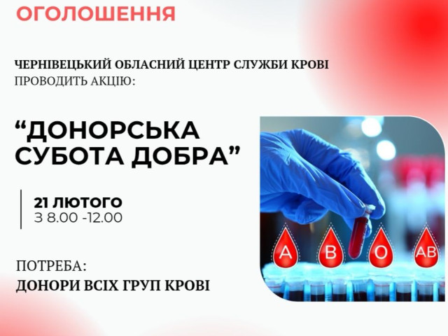 Чернівецький обласний центр служби крові запрошує мешканців громади долучитися до благодійної акції «Донорська субота добра», яка відбудеться 21 лютого.