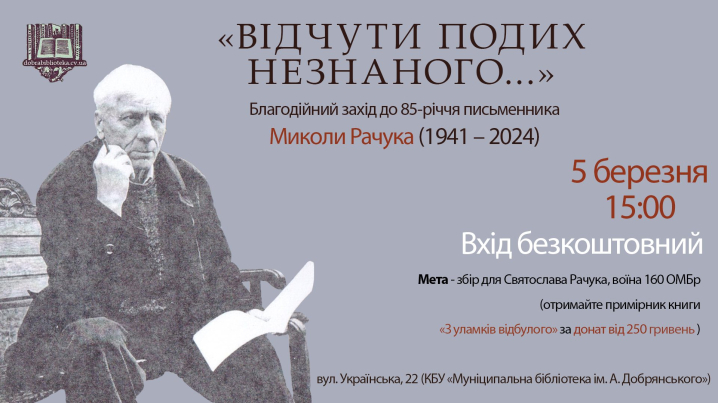 Благодійних захід, присвячений 85-річчю від дня народження письменника Миколи Рачука (1941 - 2024), відбудеться 5 березня о 15:00 в рамках проєкту кандидатки філологічних наук Світлани Кирилюк (Світлана Кирилюк) «Академічні години в Муніципальній».