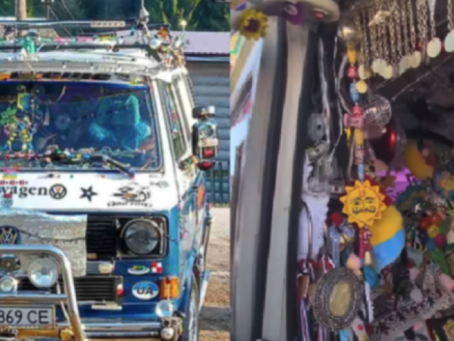 Чоловік причепив у салоні іграшки, наклейки, квіти, ляльки, кнопки, ланцюжки, образки, картинки та прапорці. Також можна побачити декоративні тканини з орнаментами, етнічні елементи, підвіски у вигляді сонця та інші різнокольорові прикраси.