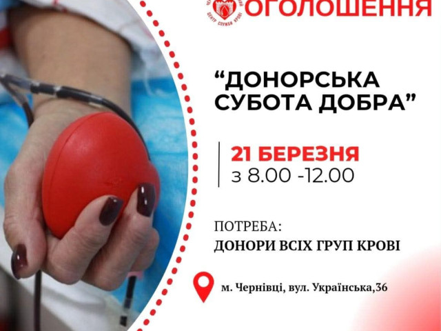Щоб кожен охочий мав змогу долучитися, Чернівецького обласного центру служби крові організовує донорську акцію у вихідний день — у суботу.