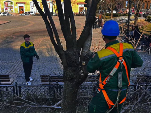 Працівники Чернівецького тресту зеленого господарства та ПЗР проводять роботи з обрізки сакур на площі Філармонії.