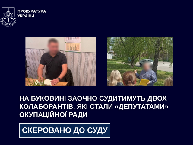 Прокурори Чернівецької обласної прокуратури скерували до суду обвинувальні акти стосовно двох жителів Донеччини — їх обвинувачують у колабораційній діяльності (ч. 5 ст. 111-1 КК України).