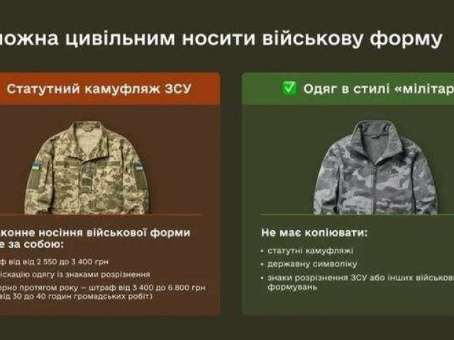 Цивільним заборонено носити статутні камуфляжі з шевронами та знаками розрізнення ЗСУ чи інших військових.
